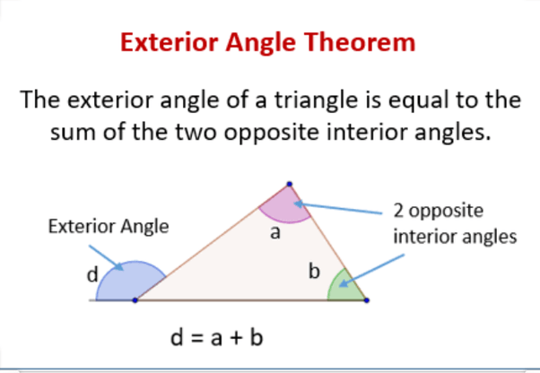 Exterior angle and remote interior angles of a triangle. Exterior angle theorem, and in the. For each exterior angle, the interior angle that it forms a linear pair with is called an adjacent interior angle. Weak exterior angle theorem let ∆abc be any triangle in the plane. M ∠ 4 = m ∠ 1 + m ∠ 2. I've drawn an arbitrary triangle right over here and i've labeled the measures of the interior angles the measure of this angle is x this one is y this one is z and what i want to prove is that the sum of the measures of the interior angles of a triangle that x plus y plus z is equal to 180 degrees and the way that i'm going to do it is using our knowledge of parallel lines or transversals of. (paragraph proof) it is given that 1≅ 2. For instance, a right triangle has one angle that … If you count one exterior angle at each vertex, the sum of the measures of the exterior angles of a polygon is always 360. The sum of the lengths of any two sides of a triangle are greater than the lengths of the opposite side. Set up an equation with the sum of the three angles, equating it with 180° and solve for 'x'. Central angle of a circle. In our example, angle d is an exterior angle, and angle a and angle b are the remote.